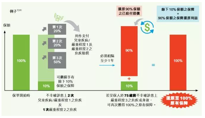 7.在理赔之后可以恢复高达90%的保额,并且可以再次获得高达100%的原始保障