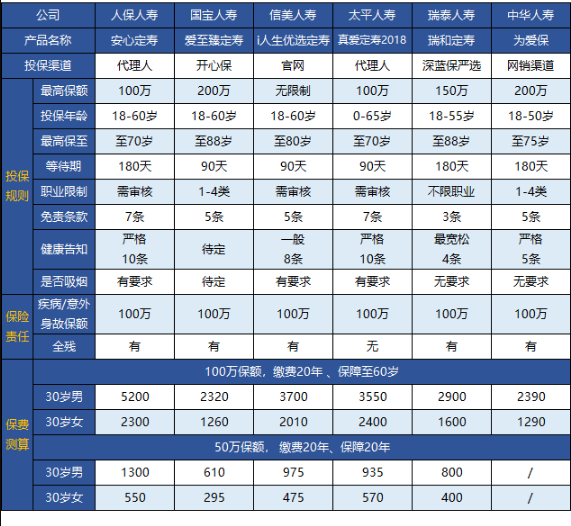 如果追求最具性价比:你可以考虑【中华联合为爱保】和【国宝爱至臻】,价格优势更加明显。中华为爱保,无论你是否抽烟,你都可以正常投保,但健康告知会更严格,如果你身体状况良好,你就可以理解。国宝爱至臻,费率也是一大优势,但尚未正式上市,有兴趣的朋友可以关注一下。