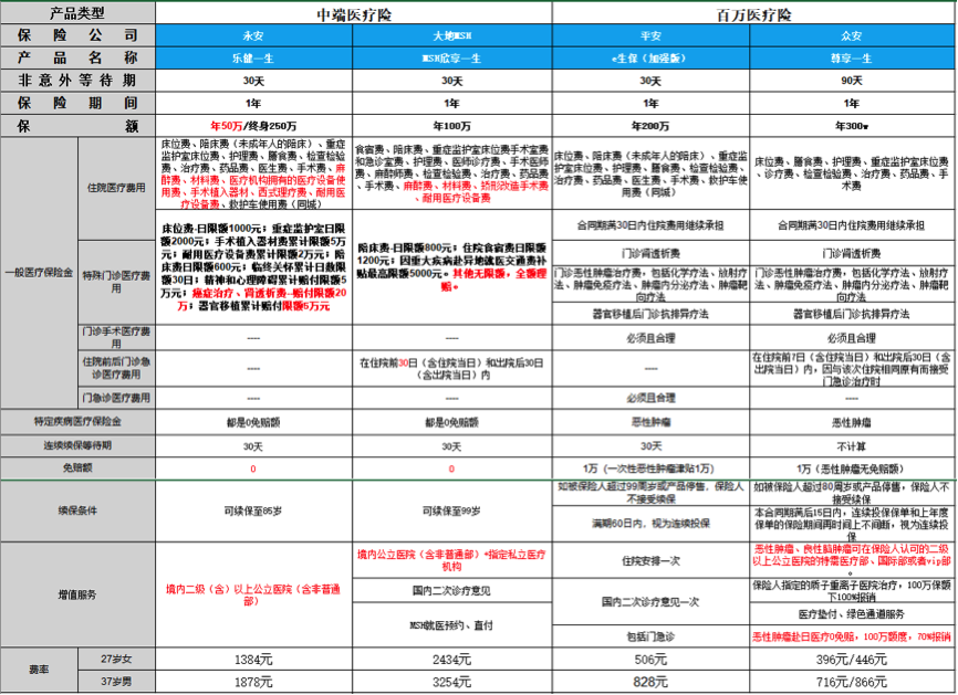 随着保险行业的不断发展,医疗保险这个险种也是更新换代非常的快,从最初的小额医疗保险,到后来的百万医疗险,中端医疗保险,高端医疗险,海外医疗险等等。今天我们就来聊一聊最近非常火的百万医疗险和终端医疗险分别是什么,已经哪些人群适合百万医疗险,哪些人群更适合中端医疗险。为了方便对比,下图是中端医疗险和百万医疗险的产品对比。