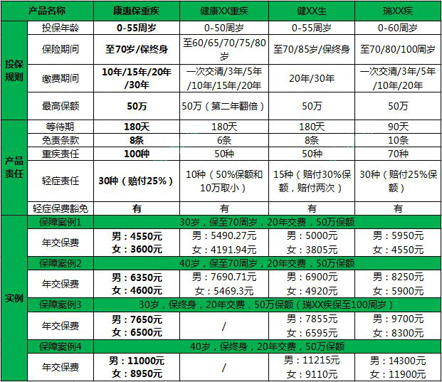 每种产品的主要职责基本相同,包括重疾、轻症和轻症保费豁。根据图中实例的对比分析,康惠保产品的速率具有一定的优势,保持70年代率的优势更大。