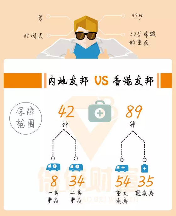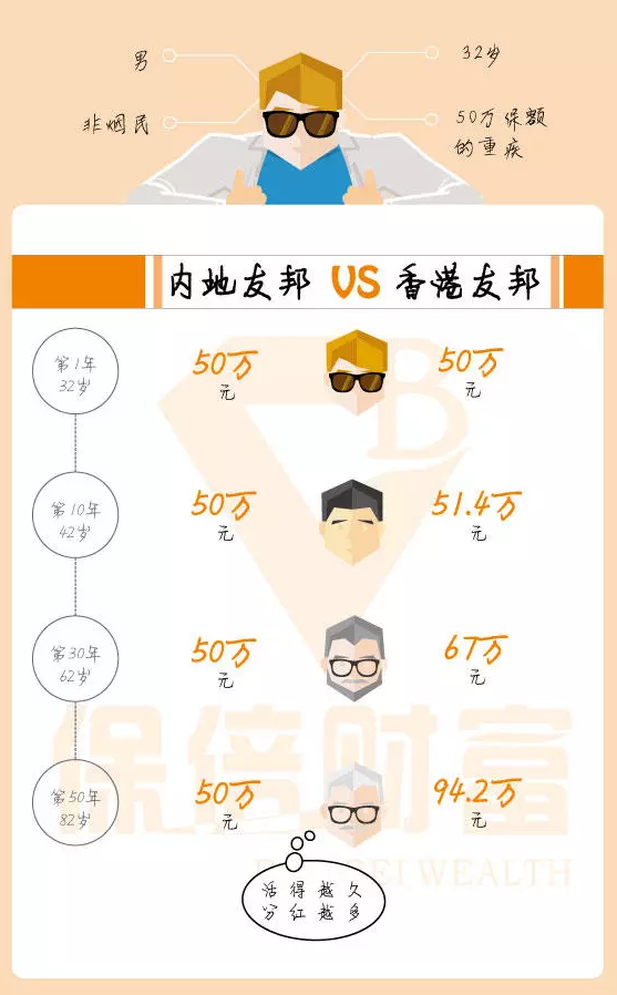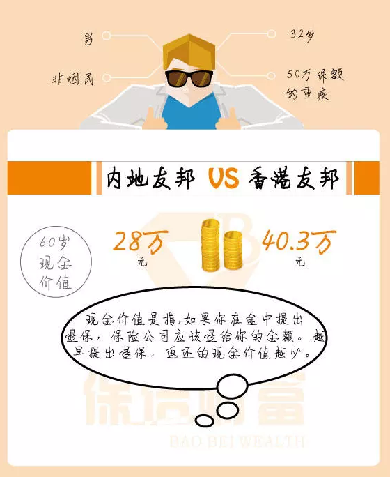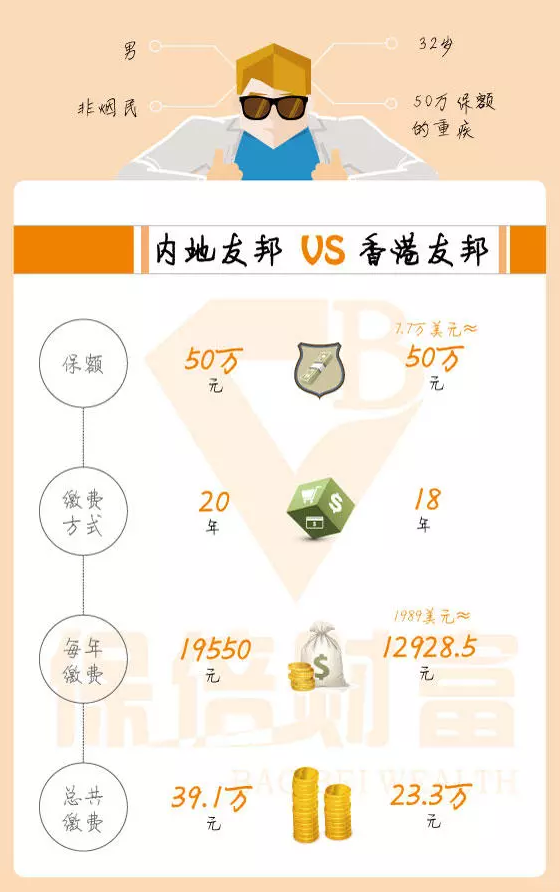 例如,被保险人是一名32岁的非吸烟男子,他想要支付50万保额的严重疾病。他对友邦非常有信心并且最初准备在内地投保,但是一位朋友告诉他购买香港保险。便宜! 香港友邦相同的保额,保障更高,保费更低。