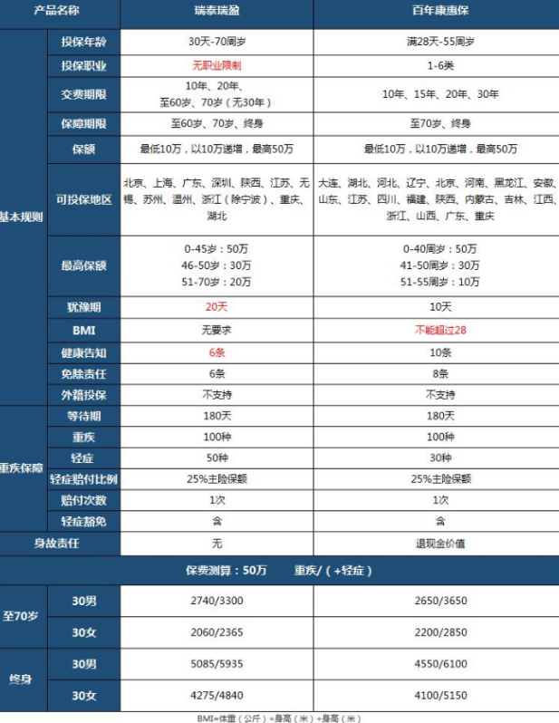 此外,瑞泰瑞盈有一个小优势,并且不需要被保险人的BMI指数。例如,在百年康惠保中,被保险人的BMI不得超过28。这意味着如果保险指数不符合标准,但身体没有异常,则可能无法确保这一重大疾病保险,或做核保处理。但瑞盈显然更友好。