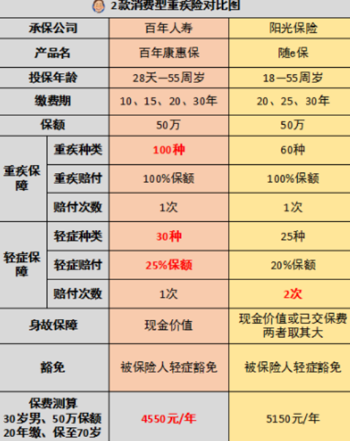 百年康惠保和阳光随e保进行了比较。图中的红色字符是它们各自的优点。