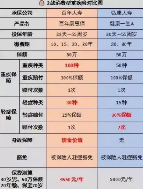 百年康惠保和健康一生A进行比较。图中的红色字符各自具有优势。