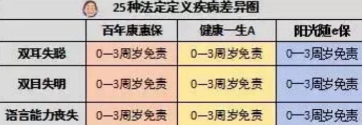 这三种产品在25种法定重疾理赔中具有相同的时间限制,例如“双目失聪、双耳失明、语言能力丧失”三种重疾所有都免于3岁以下。