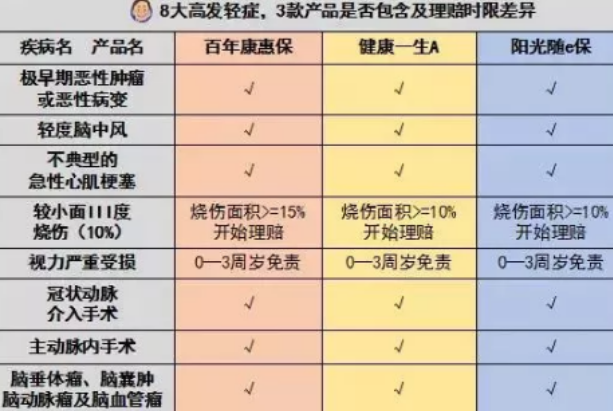 由于对轻症没有统一的规定,我根据保险公司的理赔数据找到了8款高位轻症,判断这三个产品是否覆盖了理赔的时差,如下图所示: