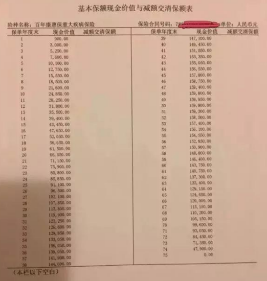 注意:百年康惠保的现金价值,上图中的现金值表示每年可以返回的金额为退保的钱,减额交清则是在无法续交保费时,现金价值充当保费。