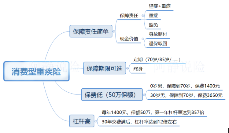 消费者重大疾病保险保障责任主要分为轻症、重症;保障期间一般有终身和定期; 0岁的男孩,500,000保额为列,保障到70岁,你可以看到保费只有1400元。保费为低;第一年的杠杆率可达到357倍,杠杆率很高。