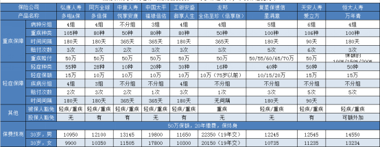 图中显示,弘康的哆啦A保、复兴保德信星满意、工银安盛的御享人生、恒大人寿的万年青,以上产品的轻症保障,相当全面。