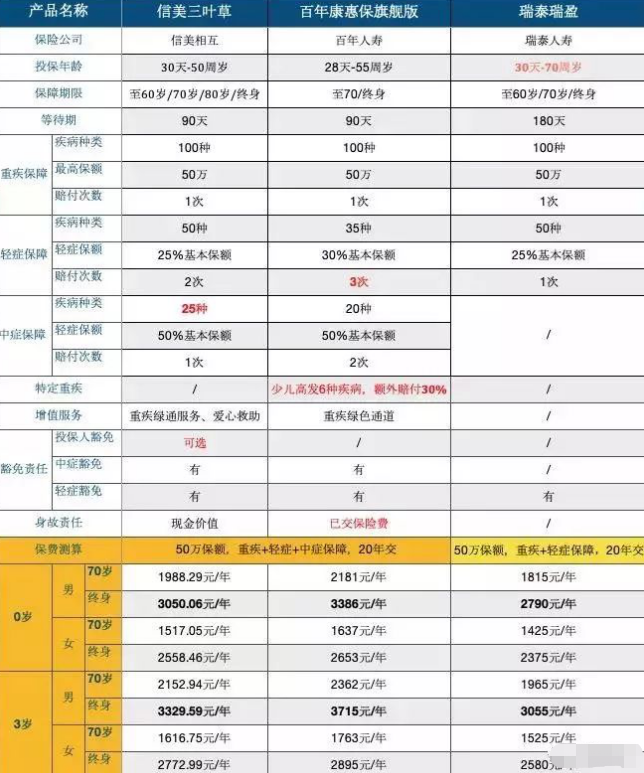 首先看看信美三叶草、百年康惠保旗舰版和瑞泰瑞盈三款长期重大疾病保险评估: