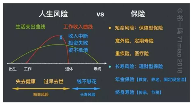 上图中的红线是我们的收入曲线,生活费用、儿童的教育取决于它。如果我们因退休前意外、疾病而失去健康甚至生命,我们将这些视为短命风险。