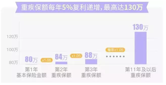 1、保额市面最高:保额将成长,前11年每年复合利息增加5%,最高可达130万