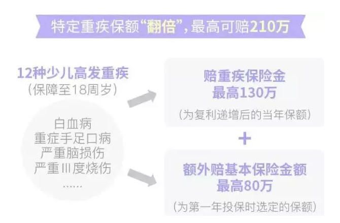 2、特异性严重疾病保额更高:12种儿童患有高比重疾病保额“翻倍”,最高可赔付210万