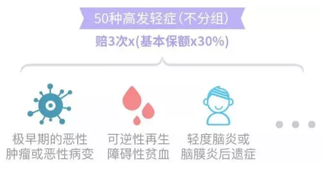 3、基本保障扎实:100种重病+ 50种轻症,轻症可不分组赔付3次。