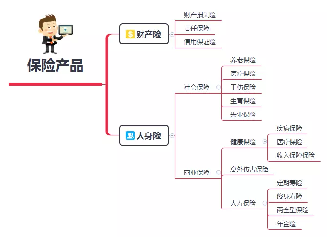 从上图可以看出,保险主要分为两类:财产保险和人身保险,然后又细分为小类。