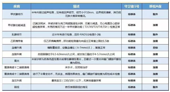 豁免保障 +智能核保 +预核保在豁免保障,守卫者1号可选保险豁免,轻症 / 中症 / 重疾 /死亡/总残疾,可以保护所有,说360°无死角。虽然,保障责任不包含中症保障,但已经在保险豁免条款中达成一致,一旦遭遇20种中症疾病,豁免后期保费。真棒!但是,应该注意的是,被保险人豁免暂时只对未成年人开放,也就是说,只有父母可以为孩子投保,如果他们想要互相保护,他们必须等待。让我们来谈谈它的智能核保,守卫者1号的智能核保相对宽松。如果身体有小问题,如甲状腺结节、乳腺结节、乙型肝炎携带者,即使是轻微的三高人口也可以正常购买。