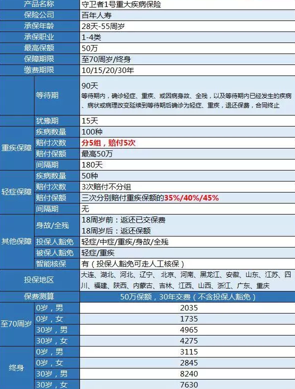 百年人寿守卫者1号多次赔付重疾险怎么样