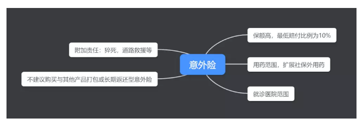 3.意外险,用于承担事故造成的死亡,残疾,医疗等风险。主要职责包括意外死亡,意外伤残(10级,281项,赔付比率10%-100%),鉴于意外的突发性和后果的不确定性,建议意外险配置更高的保额,目前超过一年综合意外险,通常可以满足“高保额,低保费”。