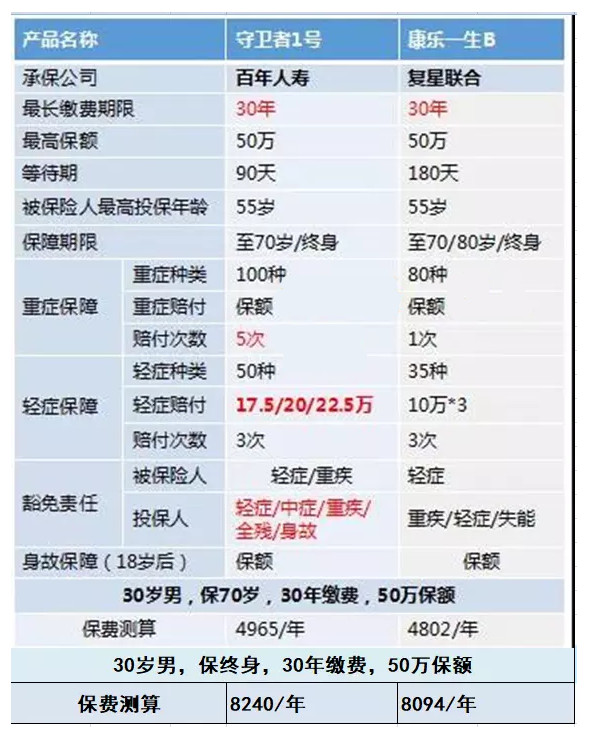 一个重疾多次赔,一个重疾一次赔;一个轻症保额赔付高,一个轻症保额少,而保费只相差200元,此时应该给守护者1号一些掌声!