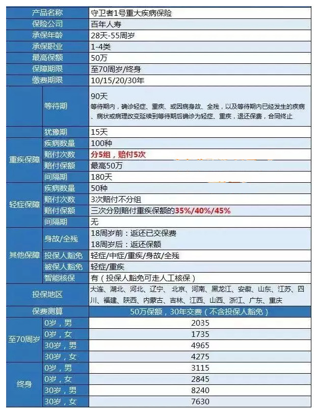 随着人们的需求逐渐扩大,保险产品更新迭代速度也变的很快,我们都知道,但从来没有想过这么快,拿百年人寿来说吧,康惠保旗舰版刚出来没几天,就再次推出了多次赔付重疾风险——守卫者1号,说是说很厉害,但它到底好不好,让我们看看这个产品是否真的如此传奇。