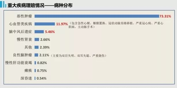 保险重大疾病保险不是更多类型的疾病,在重症疾病保险中普遍存在的六大疾病:恶性肿瘤、急性心肌梗死、主要器官移植或造血干细胞移植、冠状动脉旁路移植术、终末期肾病、中风后遗症占绝对比例(概率超过80%),这基本上满足了一般保单持有人的保障需求,保障范围涵盖了50种严重疾病,远远超过保险行业协会定义的严重疾病数量(25种),覆盖范围赔付可以达到97%。就概率而言,其中有四十个和几百个没有太大的不同。