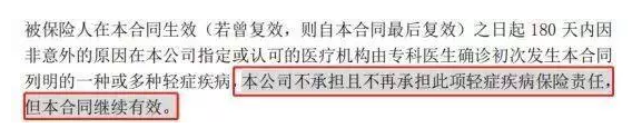 这意味着保险单在等待期间确认为轻症,而保险公司此时不是理赔,而是轻症,但不会取消合同。如果发生轻症并且合同终止,则不仅意味着理赔,而且将来也意味着保障。双保护条款非常人性化,虽然这次轻症不是赔付,但是合约没有结束,保障总是存在的。